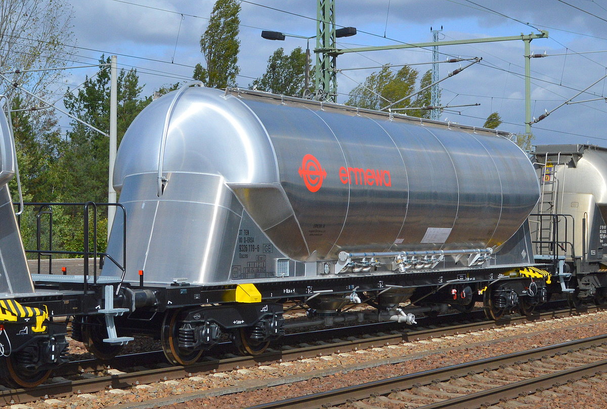 Neuerer Drehgestell-Staubgutwagen vom Einsteller ERMEWA SA mit der Nr. 37 TEN 80 D-ERSA 9326 119-6 (GE) Uacns in einem Ganzzug am 18.09.19 Bahnhof Flughafen Berlin Schönefeld.