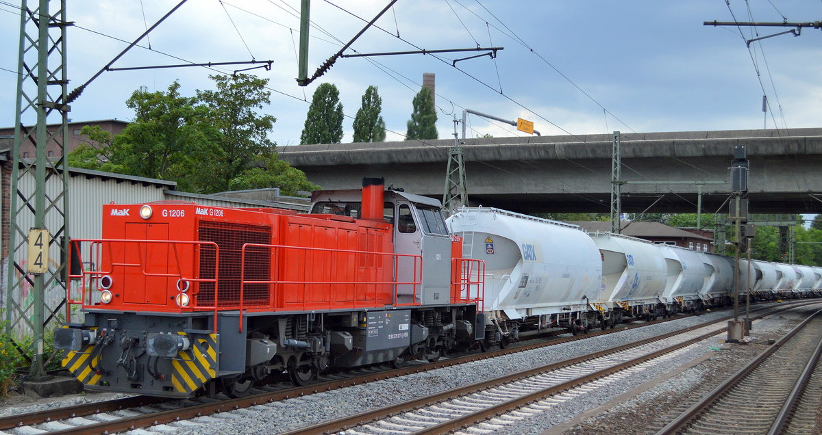Staubgutzug mit 1275 120-4 (Lok 1123 | MaK G 1206) der Regiobahn Bitterfeld Berlin GmbH (RBB) fährt in Halle (Saale), Karl-von-Thielen-Straße (Gebiet der DR), auf der Ostumfahrung für den Güterverkehr in südlicher Richtung.
