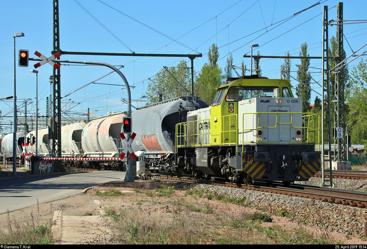 Staubgutzug mit 1275 120-4 (Lok 1123 | MaK G 1206) der Regiobahn Bitterfeld Berlin GmbH (RBB) fährt in Halle (Saale), Karl-von-Thielen-Straße (Gebiet der DR), auf der Ostumfahrung für den Güterverkehr in südlicher Richtung. [25.4.2019 | 15:14 Uhr]