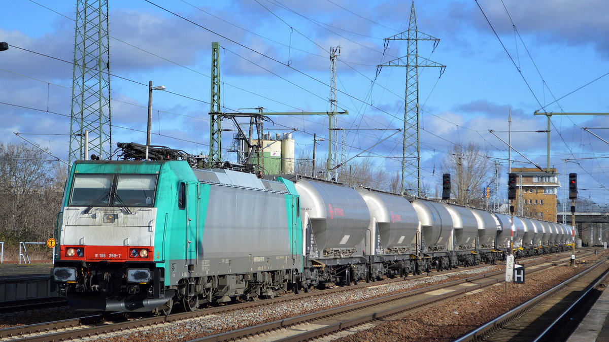 Die polnische Fa. Transchem Sp. z o.o mit  E 186 250-7  [NVR-Number: 91 51 5270 003-4 PL-TM] mit einem Ganzzug Staubgutwagen Richtung Polen am 28.01.19 Bf. Flughafen Berlin-Schönefeld.