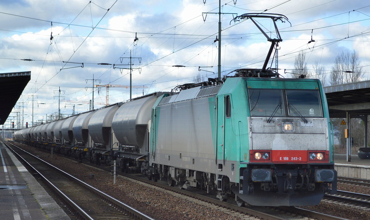 Transchem Sp. z o.o., Włocławek [PL] mit "E 186 243-2" [NVR-Nummer: 91 51 5270 001-8 PL-TM] und Staubgutzug am 05.02.20 Durchfahrt Bf. Flughafen Berlin Schönefeld.