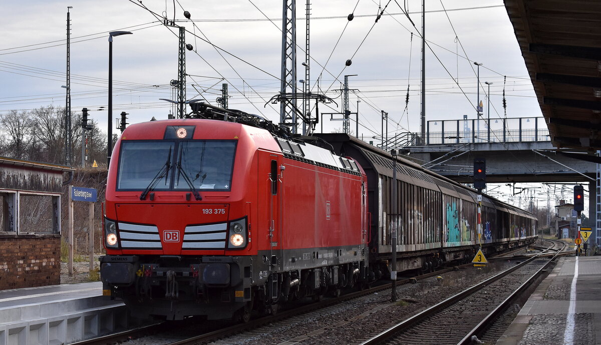 DB Cargo AG, Mainz [D] mit ihrer "193 375" [NVR-Nummer: 91 80 6193 375-3 D-DB] und einem Ganzzug Schiebewandwagen am 08.01.25 Durchfahrt Bahnhof Falkenberg (Elster). Lothar Stöckmann