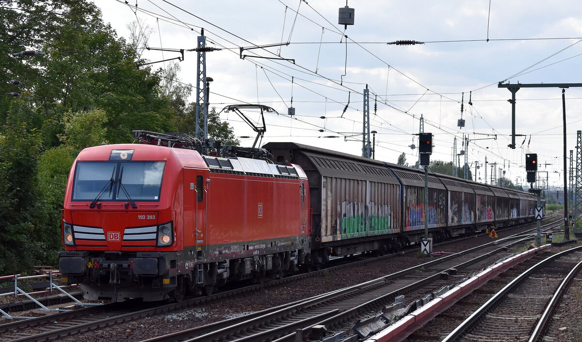 DB Cargo AG, Mainz mit ihrer "193 393" [NVR-Nummer: 91 80 6193 393-6 D-DB] und einem Ganzzug Schiebewandwagen Richtung Frankfurt/Oder am 26.08.24 Höhe Bahnhof Berlin Hirschgarten. Lothar Stöckmann