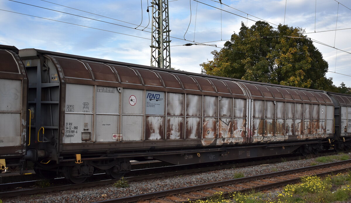 Drehgestell-Schiebewandwagen vom tschechischen Einsteller RND s.r.o. mit der Nr. 31 RIV 54 CZ-RND 2770 989-6 Habbins 3, Ladegut: Stückgüter in einem Ganzzug am 17.10.24 Höhe Bahnhof Magdeburg Neustadt. Lothar Stöckmann