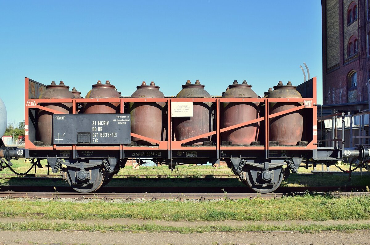 Seitenansicht auf einen alten Topfwagen Zik für Fässer mit je 1000l Fassvolumen im Magdeburger Hafen. Da damals Säuren und Laugen die Metall angreifen nicht in Kesselwagen transportieren konnte da noch keine Speziallegierung existierte wurden die Flüssigkeiten in Steinzeugtöpfen transportiert.