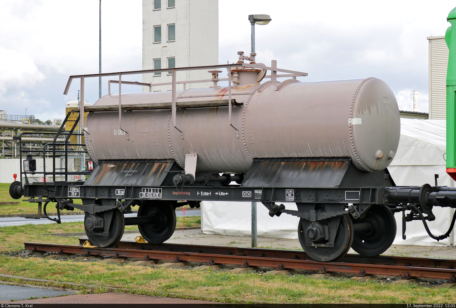 Auch einen historischen Kesselwagen hat die InfraLeuna im Bestand. Das zweiachsige Ausstellungsstück weilt auf einem kurzen Museumsgleis und trägt die Nummer 0063. Fotografiert beim ersten bundesweiten Tag der Schiene im vergangenen Jahr.