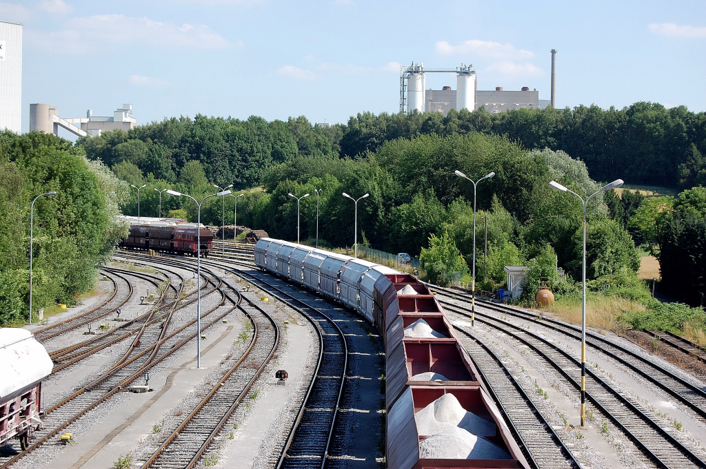 Vierachsiger Schüttgutwagen mit dosierbarer Schwerkraftentladung und der Bezeichnung "Tads960" (31 80 0834 020-6 D-DB), eingereiht in einem EZ mit 185 054-4 und fotografiert bei der Vorbeifahrt an Halle(Saale)Hbf von Bahnsteig 12/13.