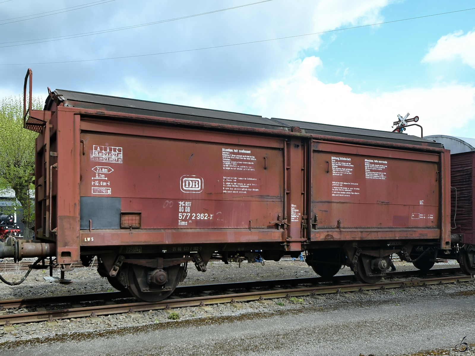 Vierachsiger Güterwagen 37 80 0806 140 D-GATXD bei der Vorbeifahrt am Heimeranplatz in München am 05.04.2024 aufgenommen. Dieser Wagen der Bauart Tamns mit modernem, zweiteiligem Schwenkdach wird für den Transport von nässeempfindlichen Gütern in loser Schüttung verwendet. Das maximale Ladegewicht des Wagens beträgt 66 Tonnen bei einem Leergewicht von 24 Tonnen. Mathias May