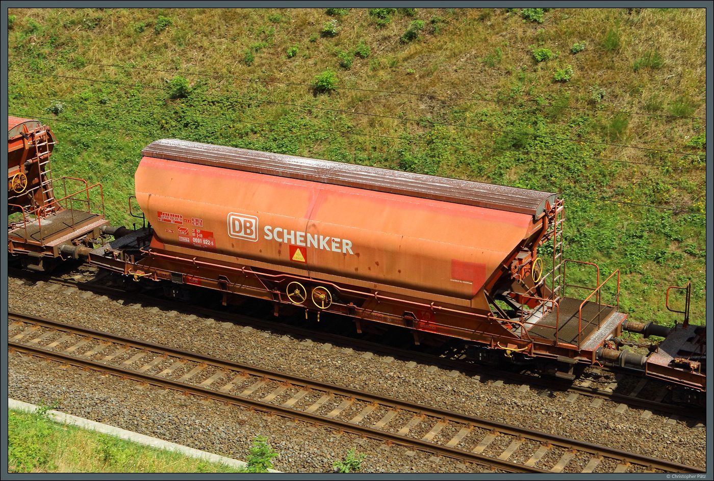 Ein gedeckter Schüttgutwagen mit schlagartiger Schwerkraft-Mittenentladung der DB Cargo mit der Nr. 31 RIV 80 D-DB 0695 672-2 Taoos-z 894 in einem Übergabezug am 24.06.24 Höhe Bahnhof Saarmund. Lothar Stöckmann