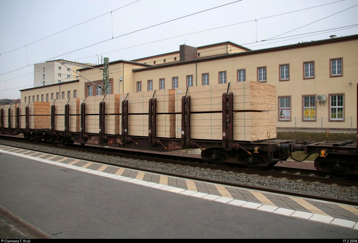 Blick auf einen mit Holz beladenen Flachwagen, der in einem gemischten Gz im Bahnhof Merseburg zu sehen und zu riechen ist. [17.2.2018 | 12:44 Uhr] Clemens Kral