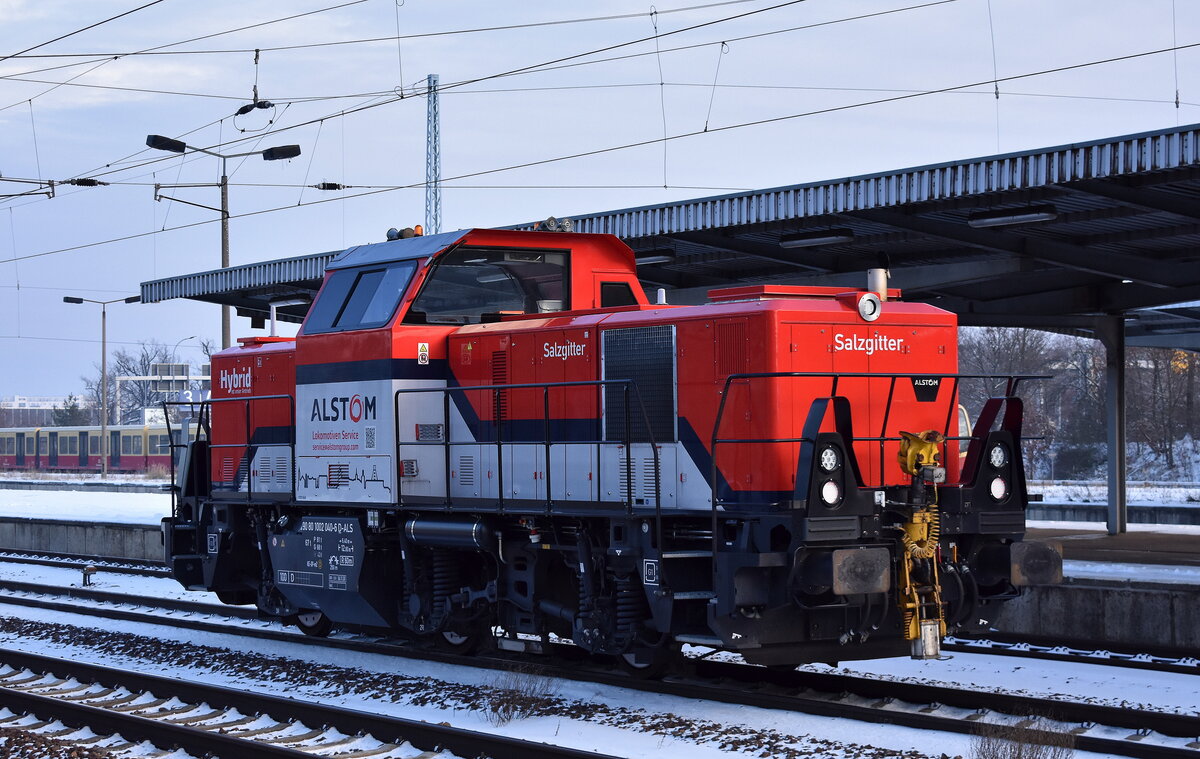 Möglicherweise immer noch für HSL Logistic GmbH, Hamburg?, die Alstom Hybridlok-Prima H3-, Name:  Salzgitter  (NVR: 90 80 1002 040-6 D-ALS ) am 18.01.24 Durchfahrt Bahnhof Schönefeld (bei Berlin).