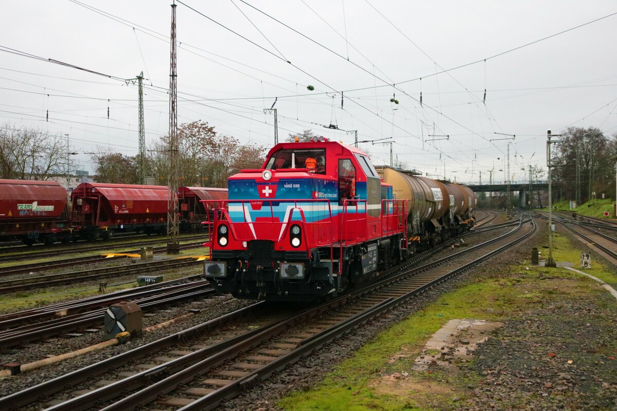 SBB Cargo International Alstom H3 1002 035-6 mit drei Kesselwagen in Hanau Hbf am 23.12.22 vom Bahnsteig aus fotografiert
