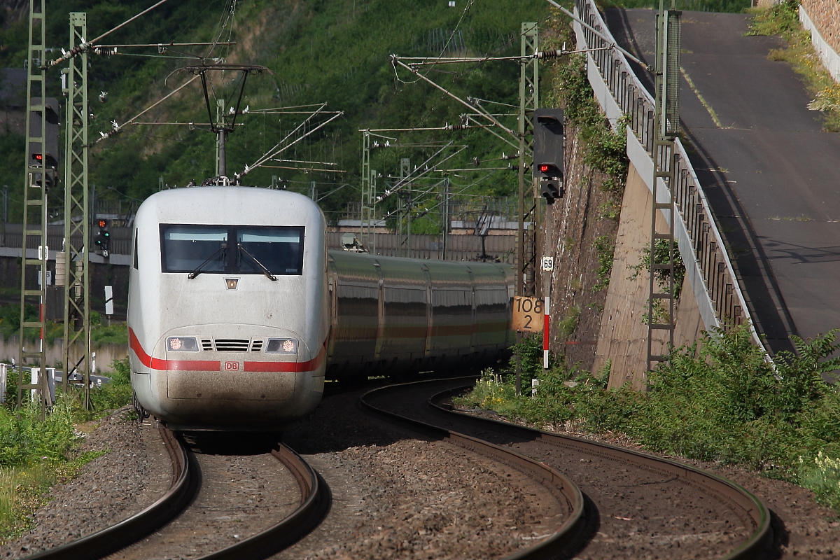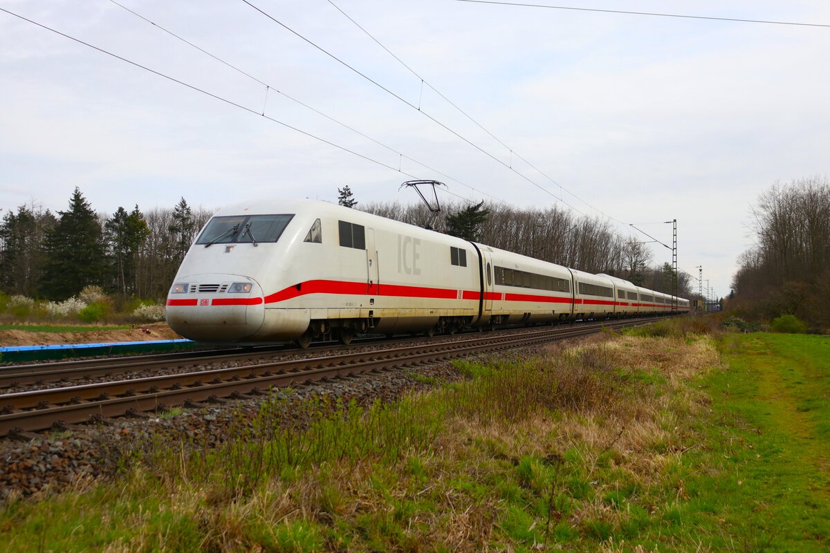 Nur noch wenige Lok bespannte IC sind noch auf der Rollbahn unterwegs. Die ICE bestreiten nahezu den kompletten DB Fernverkehr. Dabei werden aber auch die ICE 1, wie hier 401067, merkbar durch neuere Fahrzeuge verdrängt. ICE 1 hat hier am 21.4.2024 um 14.28 Uhr gerade den Lengericher Tunnel verlassen und ist auf dem Weg nach Osnabrück. Gerd Hahn