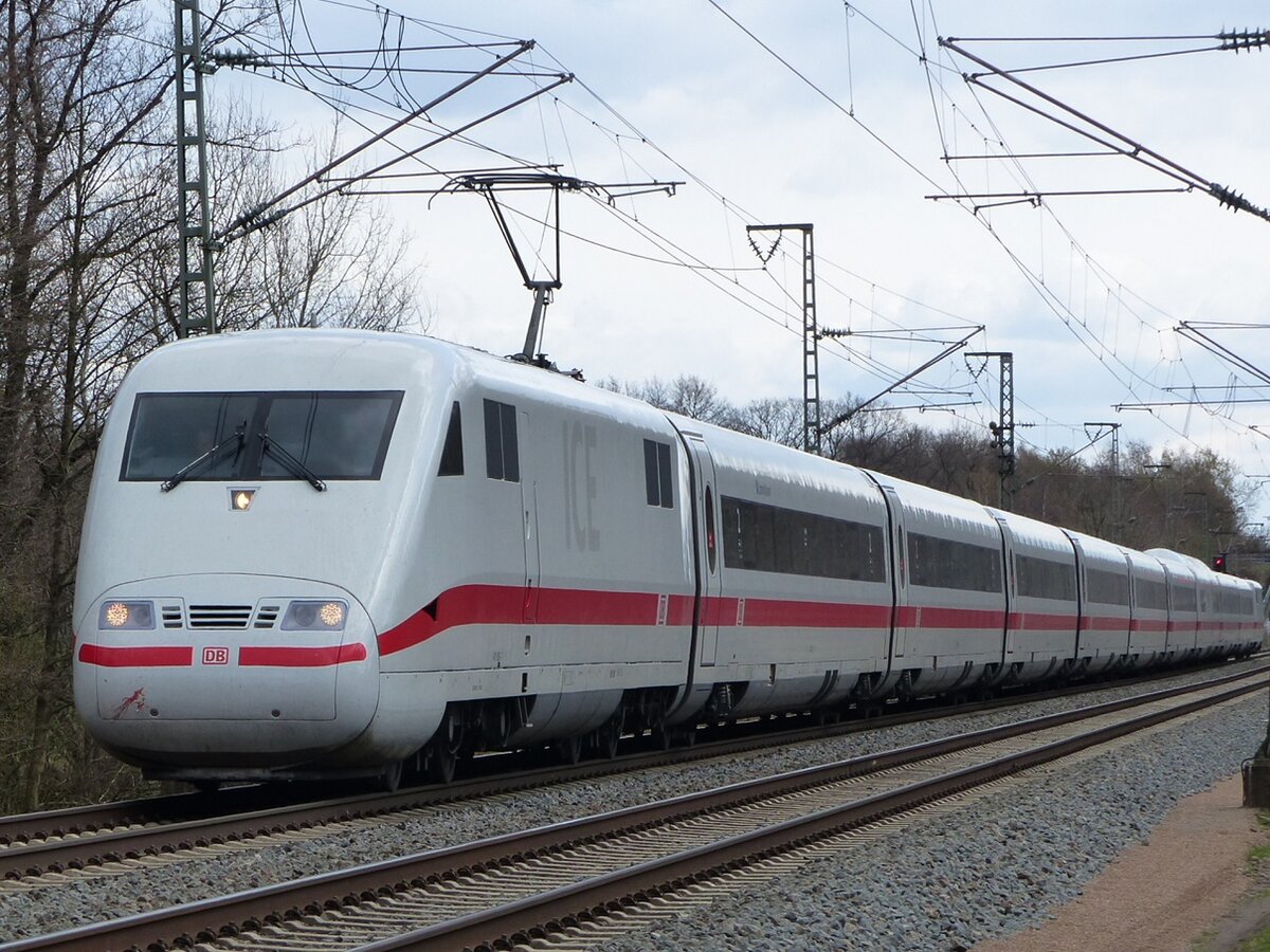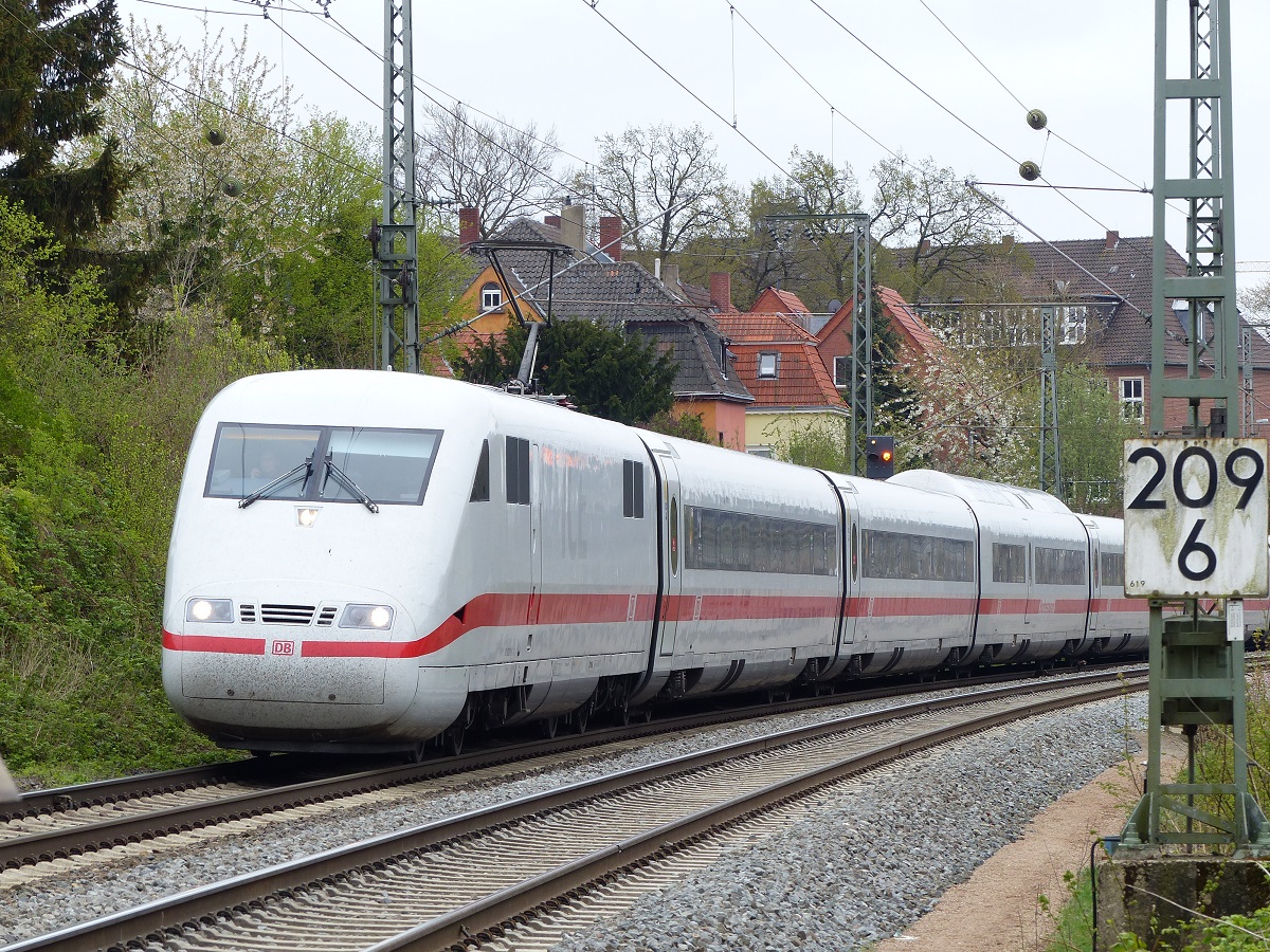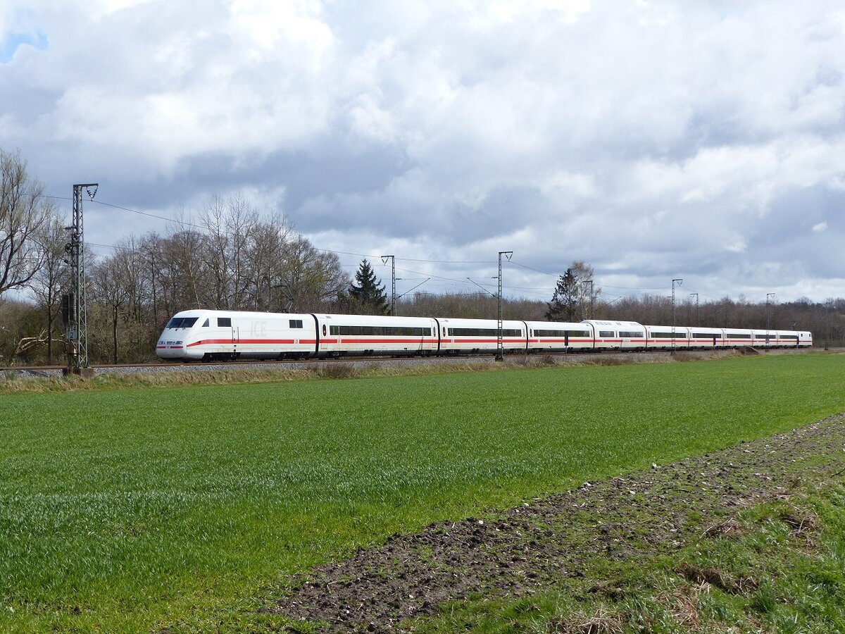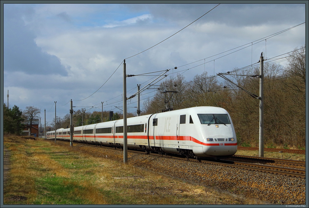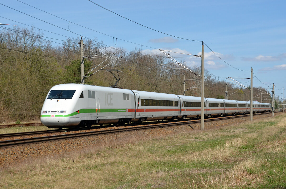 Am 18.04.22 war ein Triebzug der Reihe 401 mit grünem Streifen unterwegs als ICE 930 von Berlin nach Frankfurt(M). Hier eilt er durch Burgkemnitz Richtung Halle(S). Martin Schneider