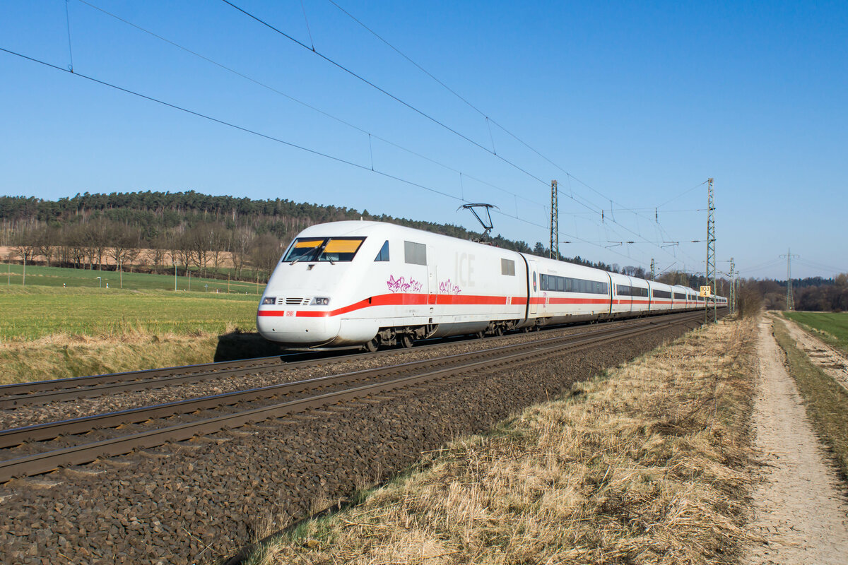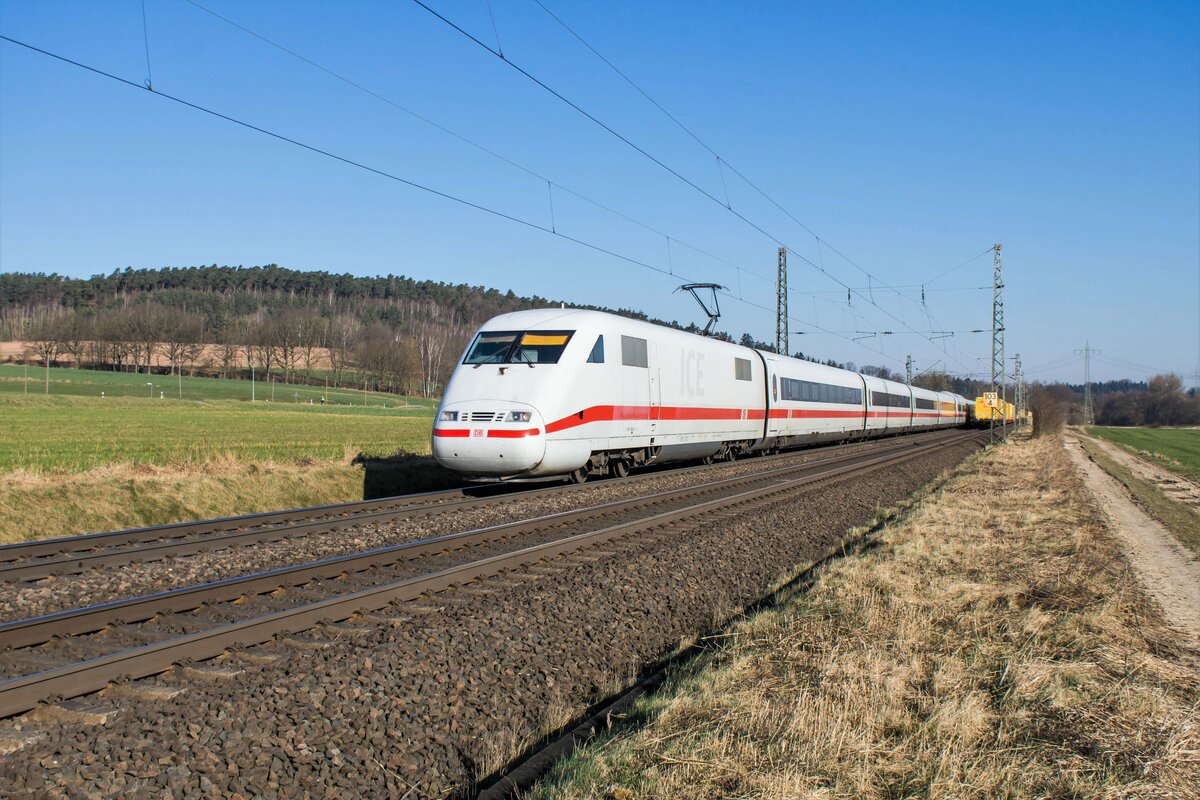 Am 08.04.22 war ein Triebzug der Reihe 401 mit teilweise grünem Streifen als ICE 930 unterwegs von Berlin nach Frankfurt(M). Hier durcheilt er Radis. Martin Schneider
