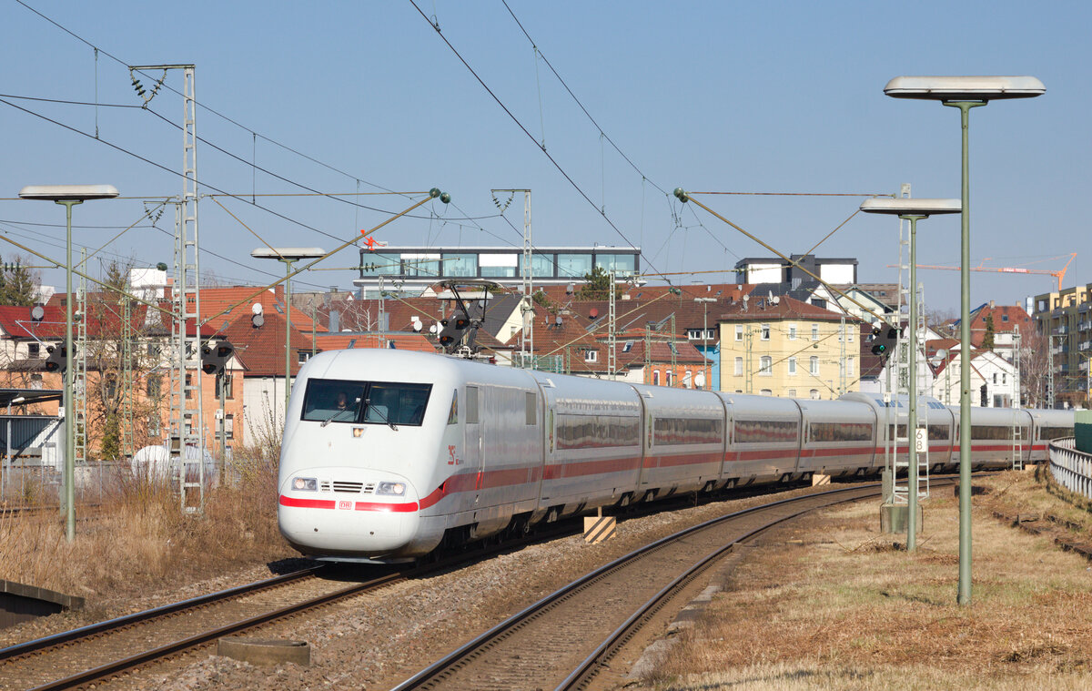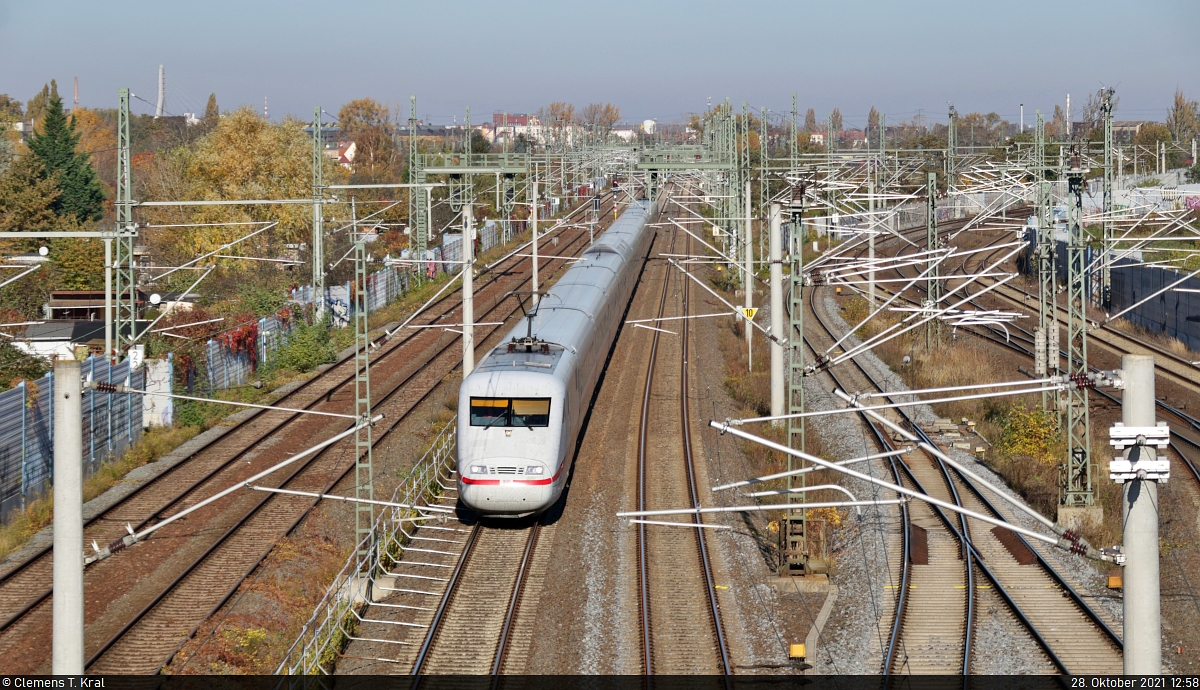 401 565-7 (Tz 165) verlässt auf Höhe des Abzweigs Halle Thüringer Bahn den Knoten Halle (Saale) und wird bald auf die Neubaustrecke Richtung Erfurt fahren.