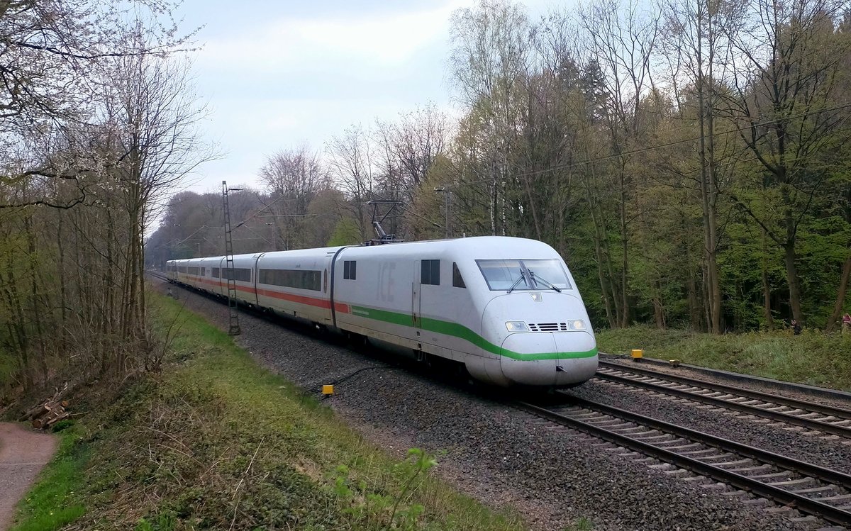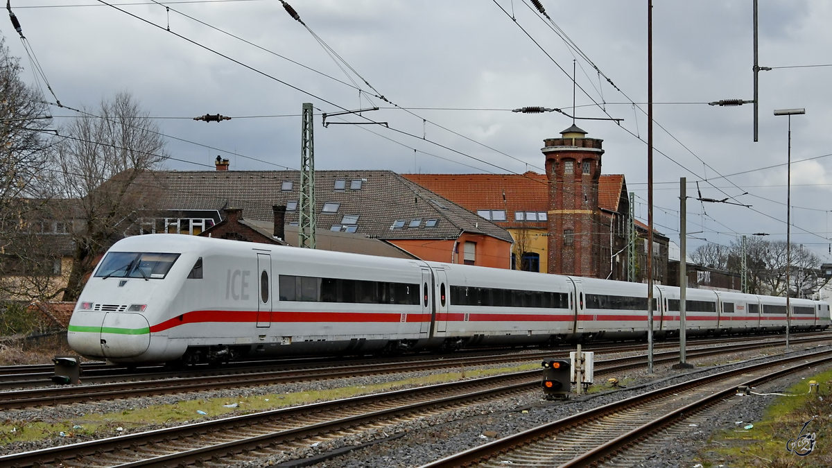Eine ICE 2 Doppel Einheit ist hier bei Hiddenhausen Schweicheln am 19.3.2021 um 11.14 Uhr in Richtung Bielefeld unterwegs. Das Kupplung Maul ist offen und erhöht dadurch den Luftwiderstand. Gerd Hahn