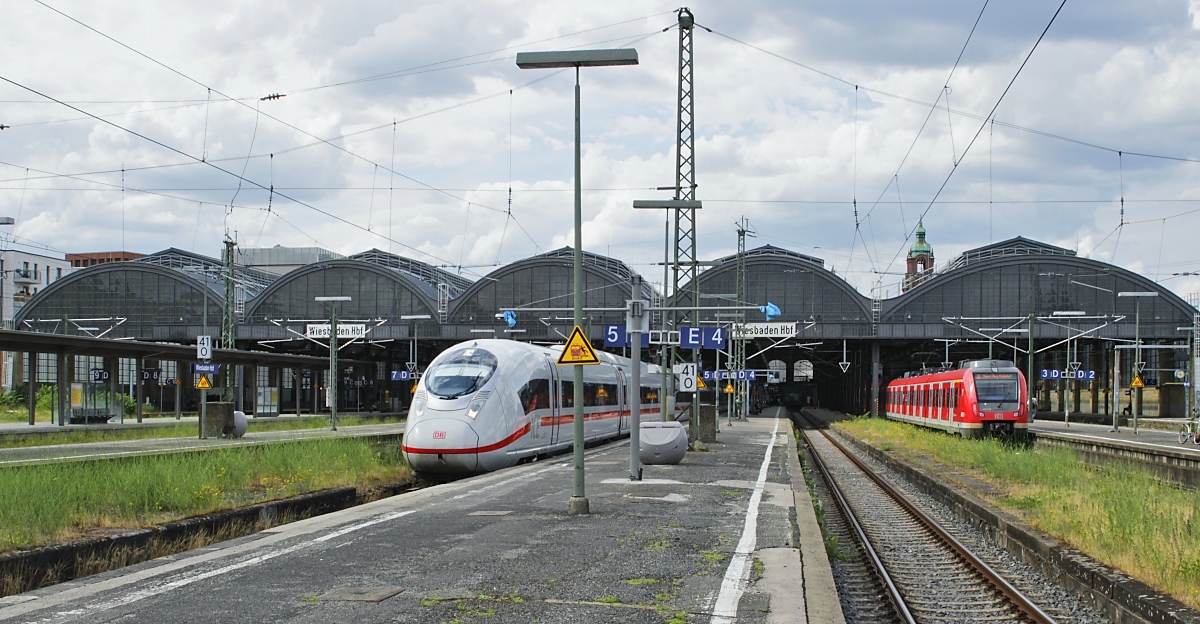 Am 27.06.2023 verlässt ein ICE 3 mit dem ICE 710 von Stuttgart nach Köln den Hauptbahnhof Wiesbaden. Ausser der im Zweistundentakt verkehrenden ICE-Linie 50 (Wiesbaden - Dresden) wird Wiesbaden nur von einzelnen ICE angefahren. Rechts im Hintergrund ein 430 der S-Bahn-Linie 8 nach Hanau Hauptbahnhof. Der 1906 in Betrieb genommene Kopfbahnhof ersetzte drei ältere Bahnhöfe. Wegen Wiesbadens Bedeutung als Kurstadt wurde bei der Planung Wert auf einen repräsentativen Bau gelegt. Horst Lüdicke