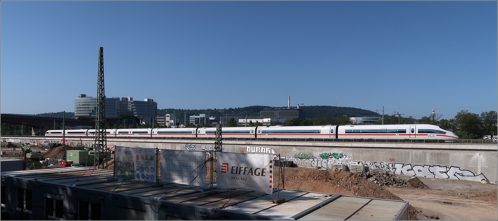 ... obwohl die Bahnstrecke von Bad Cannstatt nach Waiblingen für den Regional- und S-Bahnverkehr komplett gesperrt ist. Um über 1000 km neue Kabel zu verlegen musste dieser Steckenabschnitt vom 12. Mai bis 29.Juli 2023 nahezu komplett gesperrt werden. Seit 09. Juni kann allerdings der IC Stuttgart - Karlsruhe wieder bedingt über die Strecke fahren, unter Nutzung der 'Interregiokurve.'