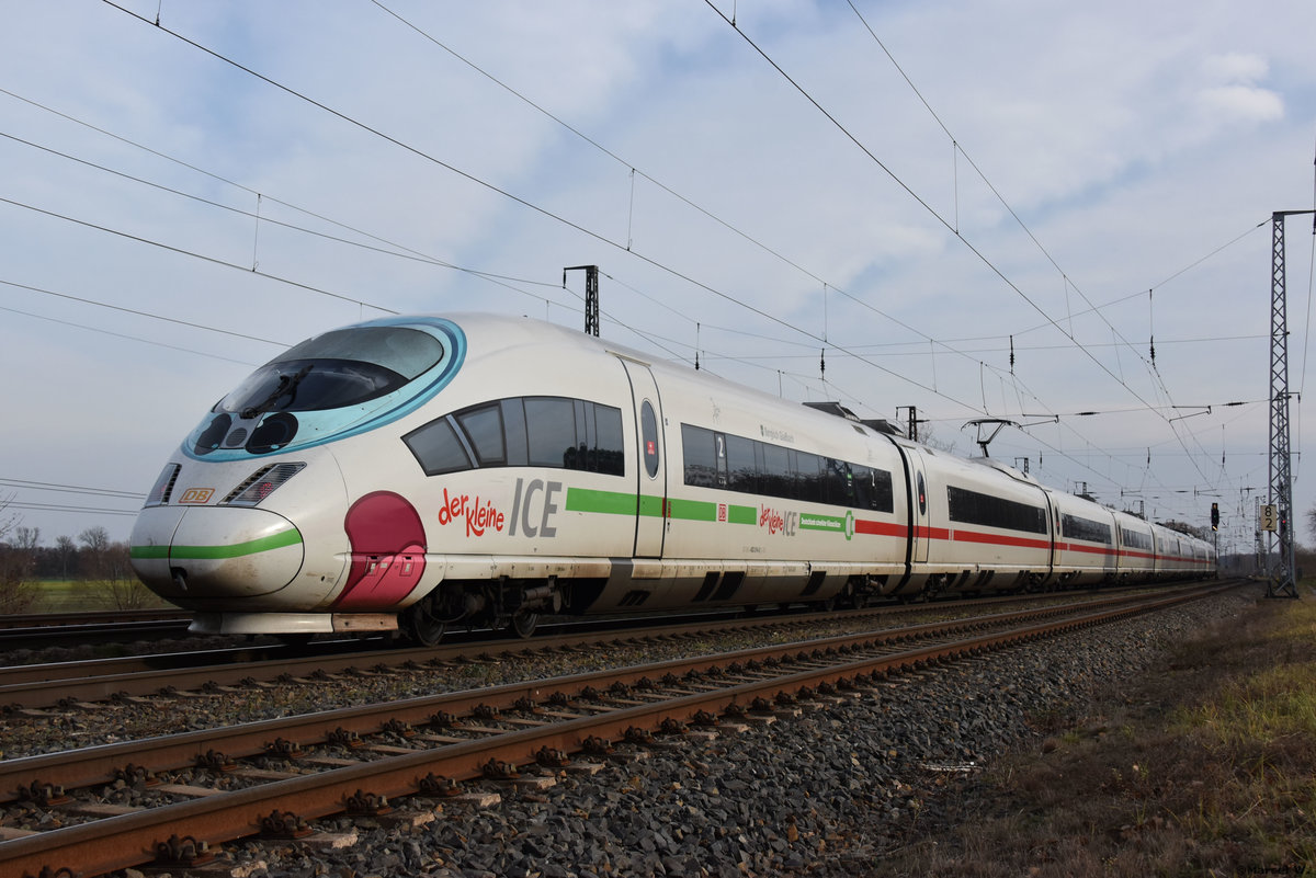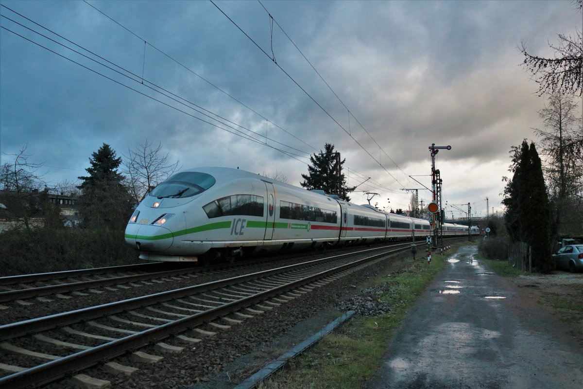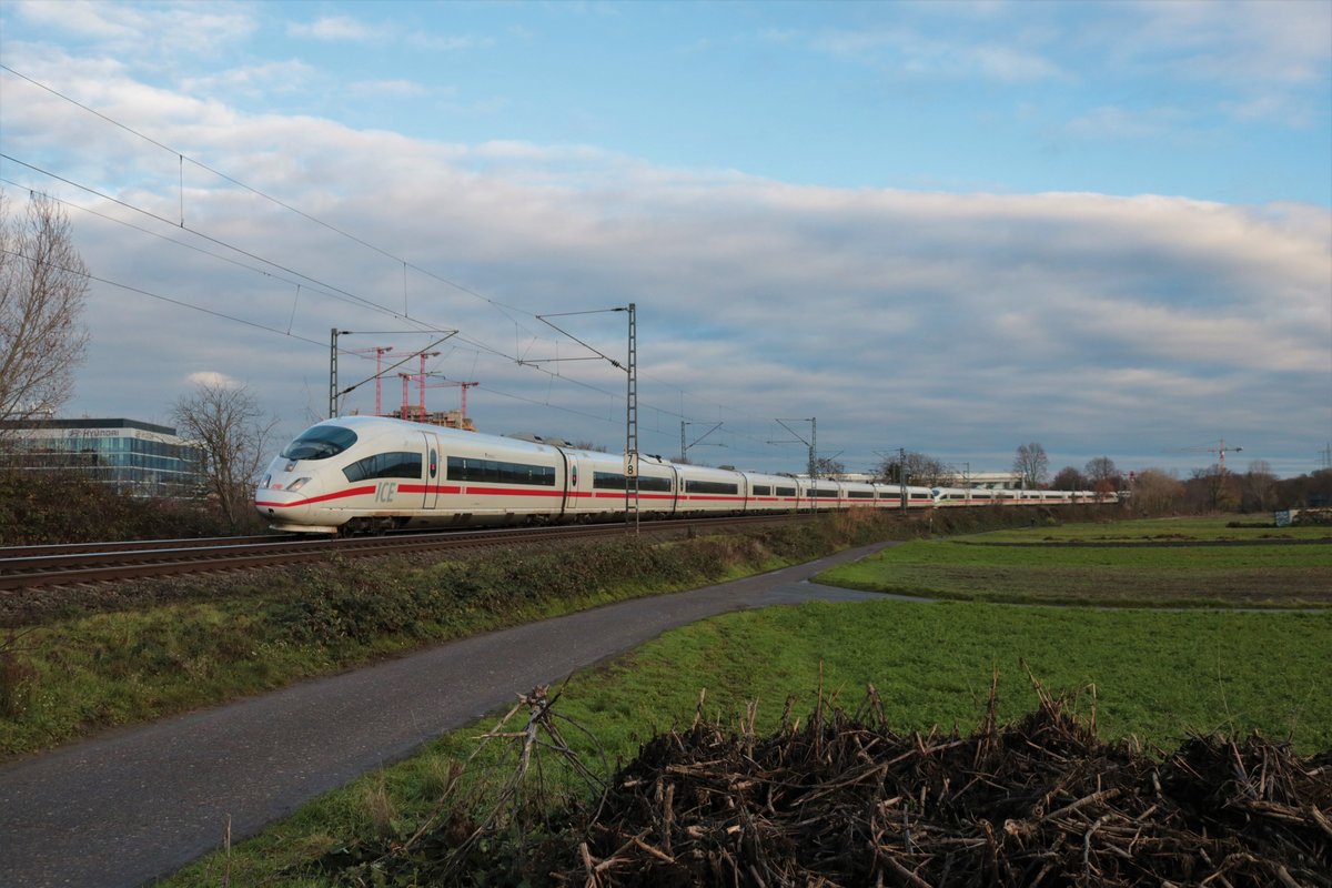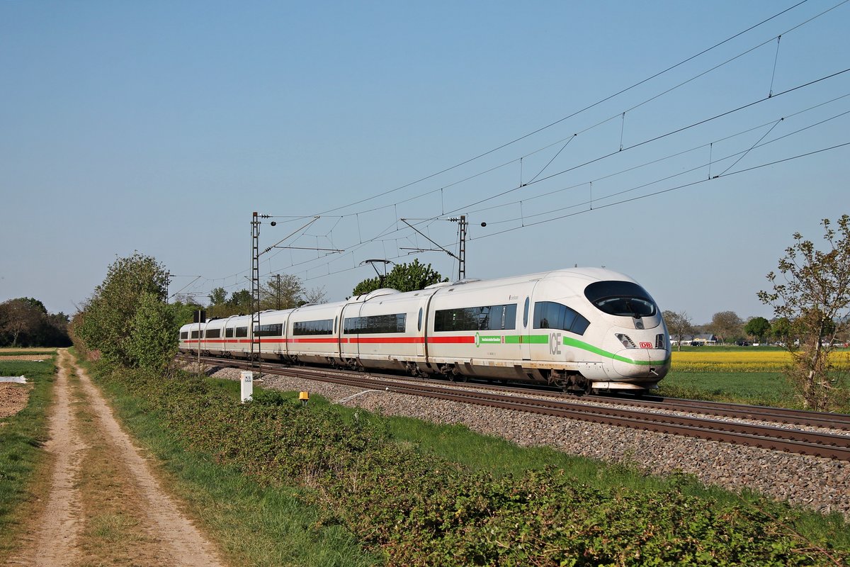 Als ICE 100 (Basel Bad Bf - Dortmund Hbf) fuhr am Abend des 23.04.2020 der 403 052-4 "Mönchengladbach" zwischen Hügelheim und Buggingen über die KBS 702 durchs Rheintal in Richtung Freiburg (Breisgau). Tobias Schmidt