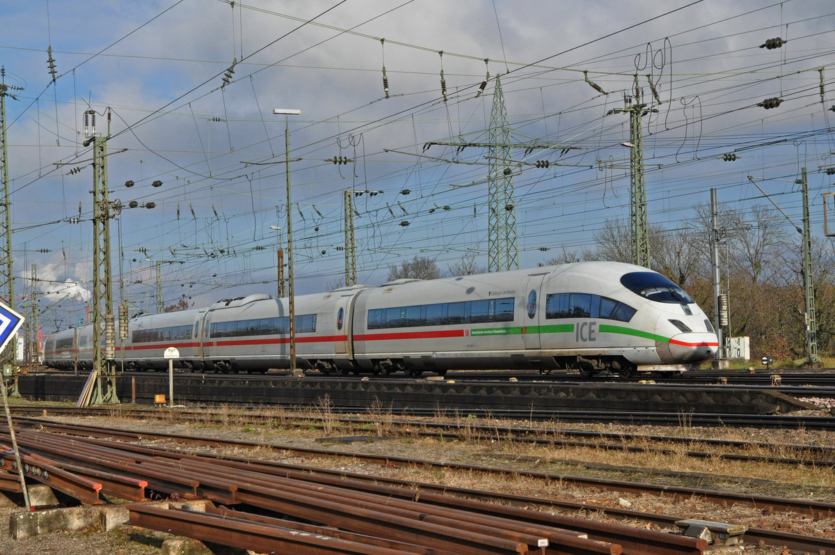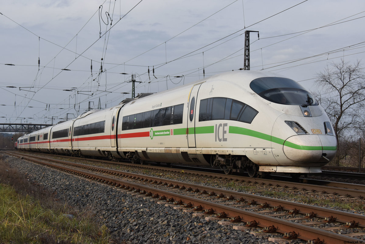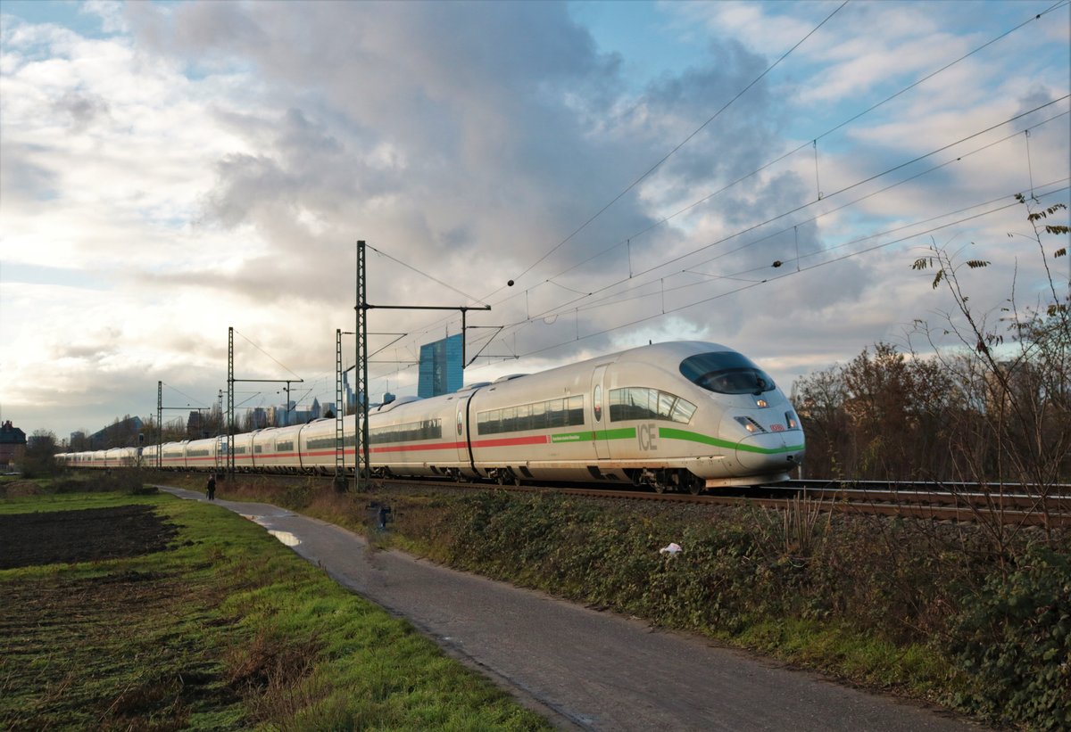 Als ICE 100 (Basel Bad Bf - Dortmund Hbf) fuhr am Abend des 23.04.2020 der 403 052-4 "Mönchengladbach" zwischen Hügelheim und Buggingen über die KBS 702 durchs Rheintal in Richtung Freiburg (Breisgau). Tobias Schmidt