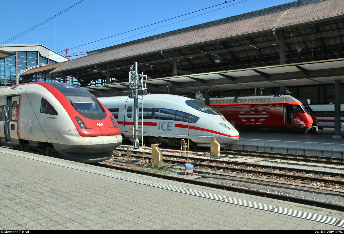 Eingekesselt vom Fernverkehr der SBB steht 403 536-6 (Tz 336 "Ingolstadt") als ICE 108 (Linie 43) nach Köln Hbf (D) in seinem Startbahnhof Basel SBB (CH) auf Gleis 12.