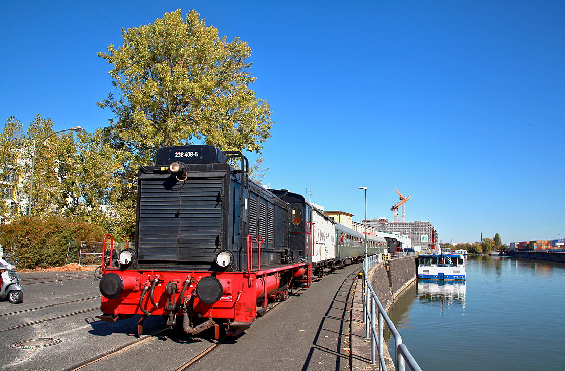 Nachdem 236 103-8 (DR V 36 | Wehrmachtslokomotive WR 360 C 14) des Eisenbahnmuseums Arnstadt anlässlich des Sommerfests unter dem Motto "Diesellokomotiven der ehemaligen DR" ein paar Umdrehungen auf der Drehscheibe des DB Musems Halle (Saale) hinter sich brachte, rangiert sie unter Beobachtung zahlreicher Eisenbahnfreunde zurück in den Ringlokschuppen auf Gleis 16.