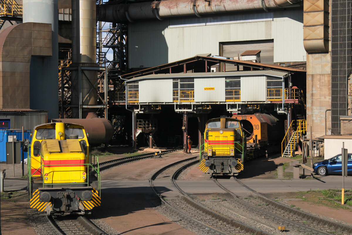 R1 (Henschel 31071/1965) und D11 (Henschel 31238/1967) stehen in der Nähe des Hochofens 4 und warten auf neue Einsätze. (Dillingen (Saar), 02.04.2025) Leonhard Groß