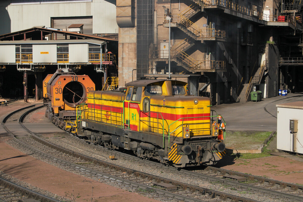 Dillinger Hütte D11 (Henschel 31238/1967) und Rogesa R1 (Henschel 31071/1965) rangieren am 01.03.2026 einen Torpedopfannenwagen am Hochofen 4 der Dillinger Hütte. Leonhard Groß