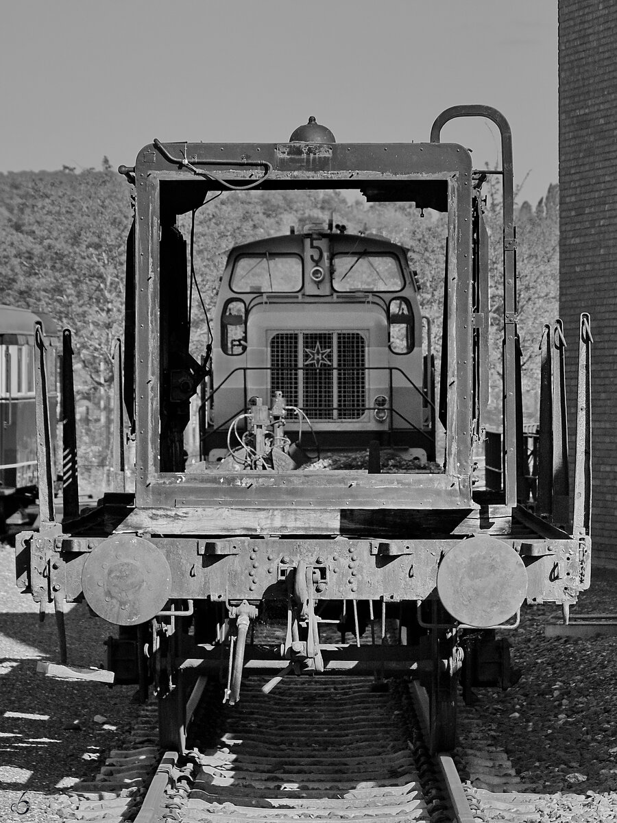 Diese auf einem Flachwagen gestellte Motorhaube stammt vermutlich von der 1939 gebauten Diesellokomotive V36 231. (Eisenbahnmuseum Bochum, April 2025) Christian Bremer