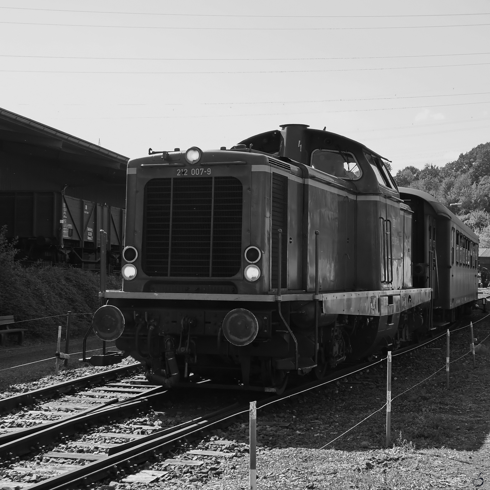 Die 1962 bei MaK gebaute Diesellokomotive 212 007-9 zieht einen Personenzug zum Bahnhof Bochum-Dahlhausen, so gesehen Ende April 2025 im Bochumer Eisenbahnmuseum. Christian Bremer