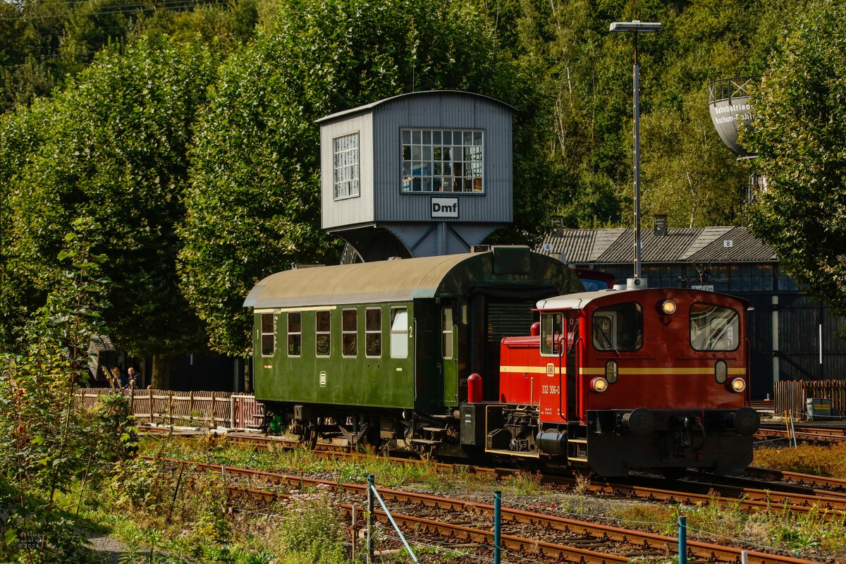 332 306-0 DB mit einem Personenwagen (Donnerbüchse) im Eisenbahnmuseum Bochum Dahlhausen, September 2024.
