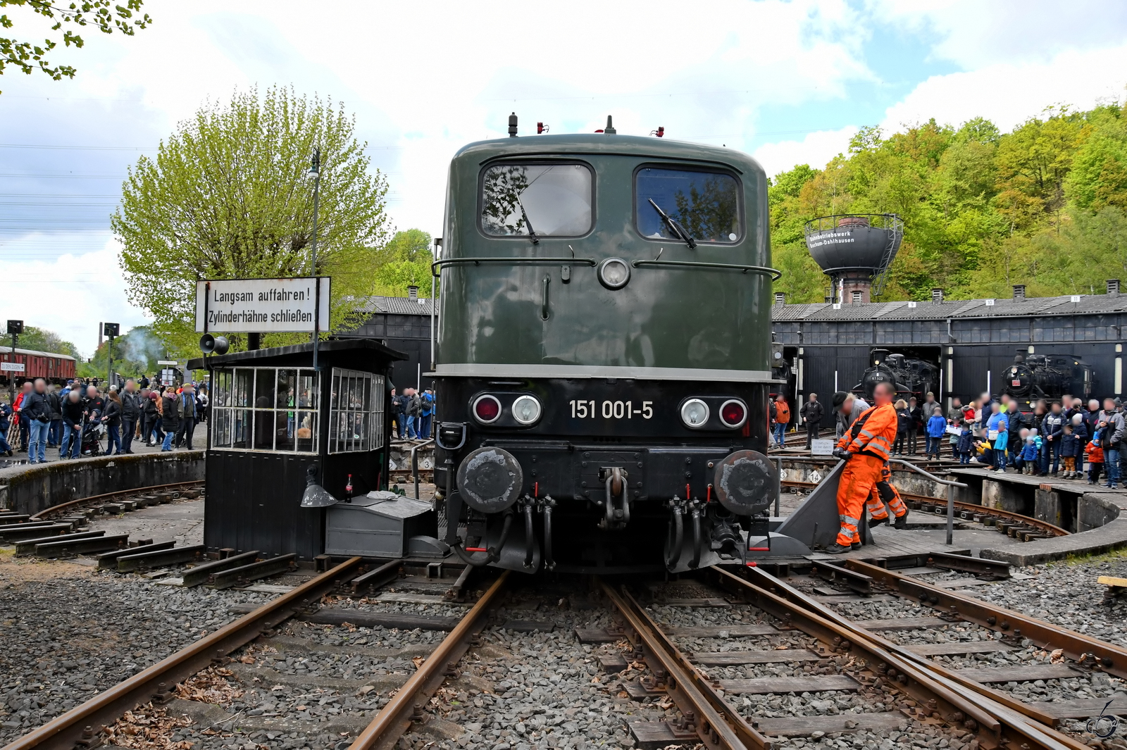 Auf Handbetrieb umgestellt - hatten Mitte April 2024 diese beiden Herren die Drehscheibe des Eisenbahnmuseums in Bochum. Dementsprechend dauerte es auch einige Zeit, bis die Elektrolokomotive 151 001-5 am gewünschten Gleis angekommen war. Das Publikum hatte sichtlich Spaß an der Aktion. (Eisenbahnmuseum Bochum, April 2024) Christian Bremer
