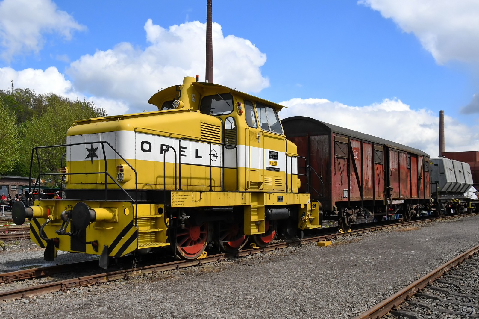 Die 1962 bei Henschel gebaute Lokomotive DH500Ca (V28-105) des ehemaligen Bochumer Opelwerkes ist hier vor einem fiktiven Güterzug zu sehen. (Eisenbahnmuseum Bochum, April 2024) Christian Bremer