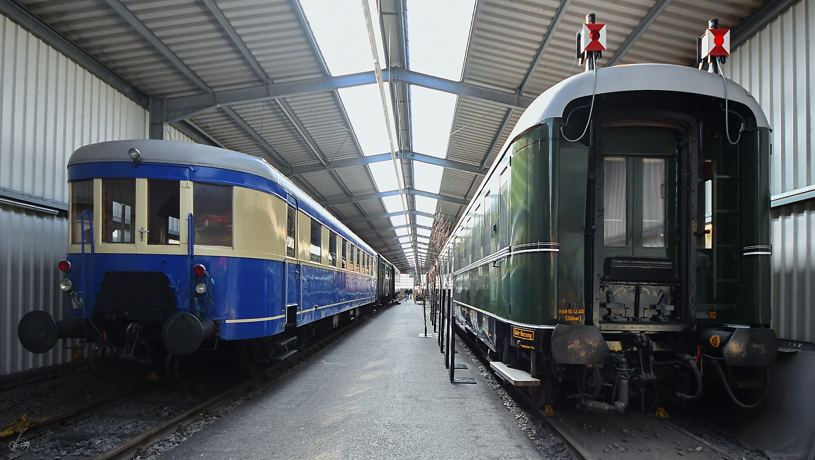 Hier zu sehenPartywagen B405 von Railflex, welcher 1934 aus einem bei der Deutschen Reichsbahn Gesellschaft als VB 145 0 93 in Dienst gestellten Steuerwagen entstand und der 1937 gebaute Salonbegleiterschlafwagen Sal Begl 4ü-37 10222 Bln. (Eisenbahnmuseum Bochum, April 2025) Christian Bremer