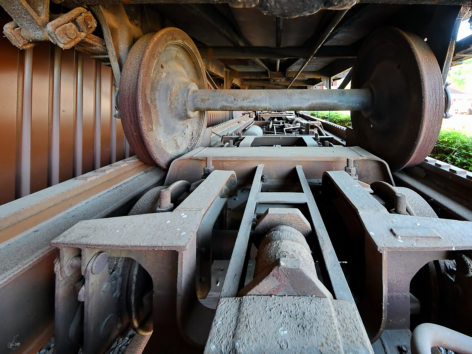 Im Bild ein Radsatz des offenen Güterwagens (Duisburg 14 336, Baujahr 1949), welcher auf einem 1963 gebauten Rollwagen (HSB 99-06-37) steht. (Eisenbahnmuseum Bochum, April 2025) Christian Bremer