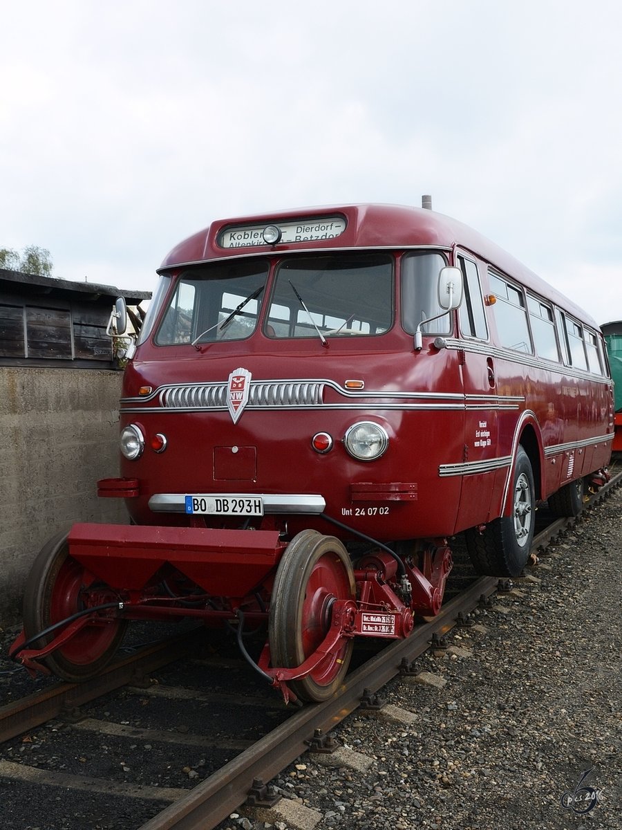 Der Schienen-Straßen-Omnibus BS300 der Firma Nordwestdeutscher Fahrzeugbau im Eisenbahnmuseum Bochum (September 2016)