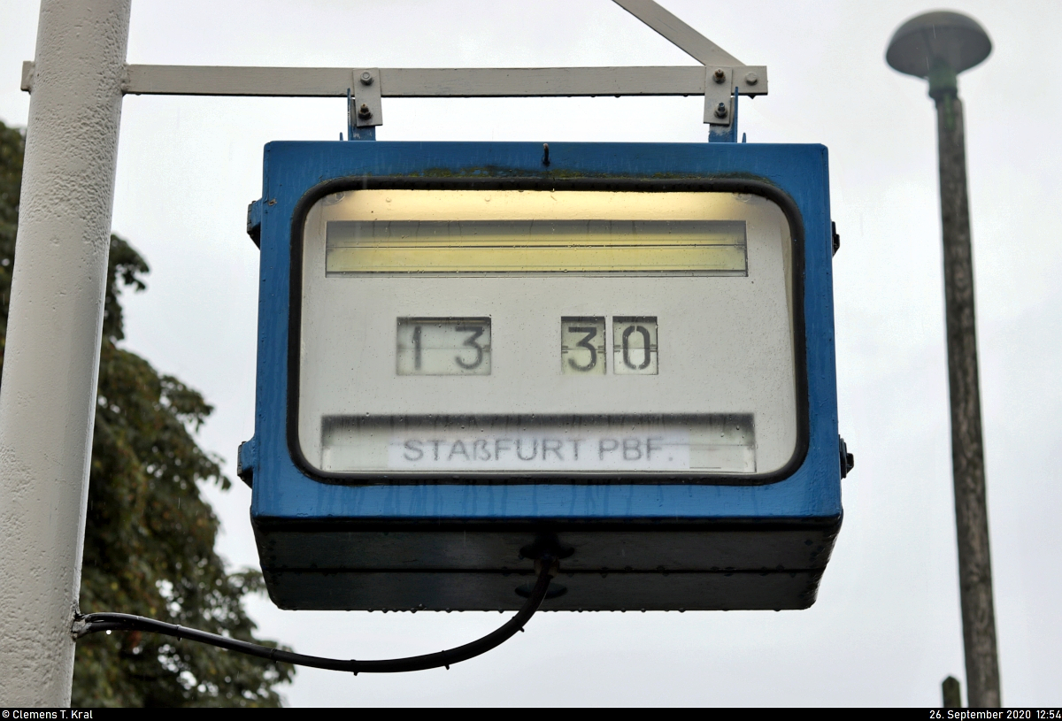 Am Museumsbahnsteig Staßfurt-Leopoldshall auf dem Gelände des Lokschuppen Staßfurt hängt diese alte Anzeigetafel. Sie kündigt die nächste Pendelfahrt zum Bahnhof Staßfurt an.