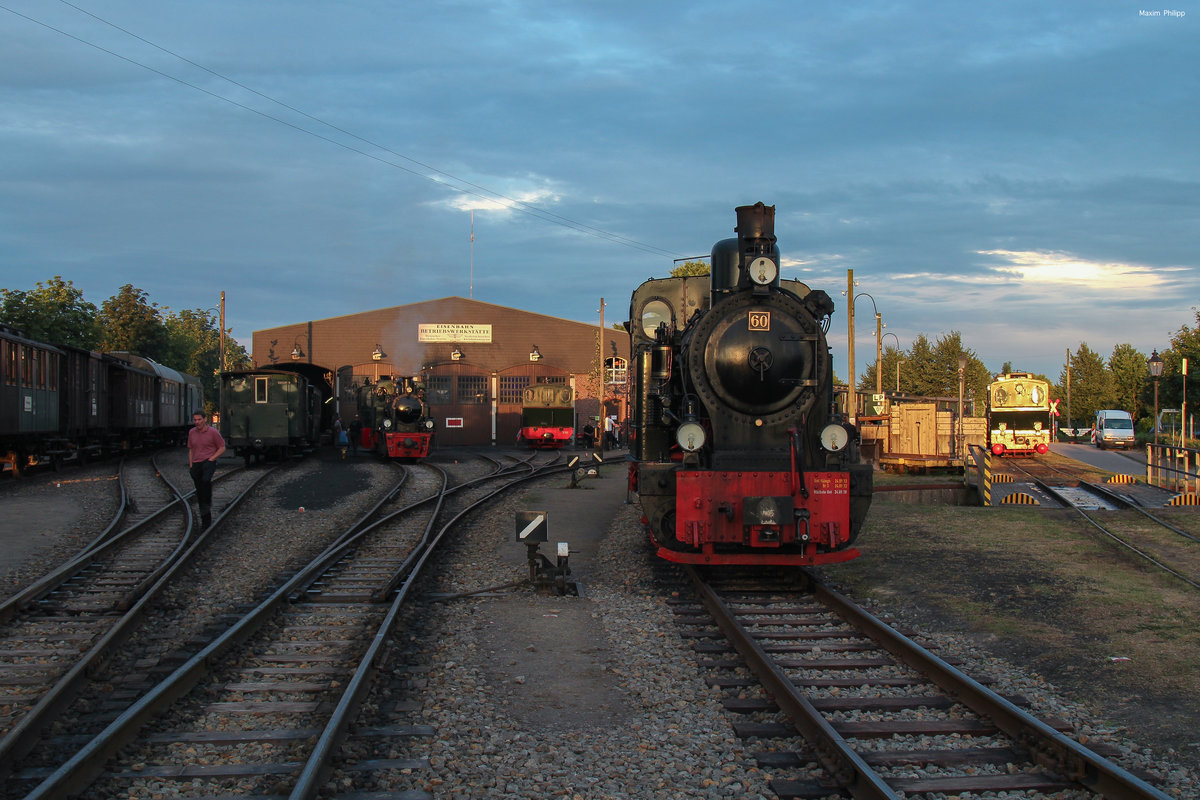 50 Jahre DEV (Deutscher Eisenbahn Verein e.V.): Lok 20 'Haspe' (Selfkantbahn, ex. Hütte Hagen-Haspe), DEV 'Plettenberg' (ex. Plettenberger Kleinbahn), DEV 'Hoya' (ex. Kleinbahn Hoya - Syke - Asendorf), MME 'Bieberlies' (Sauerländer Kleinbahn, ex. Biebertalbahn, Kleinbahn Gießen - Bieber) und zur rechten die DEV 'Spreewald' (ex. Pillkaller Kleinbahn, Schloßberger Kleinbahn, ex. DR Spreewaldbahn) in der Abendsonne des 31. Juli 2016 im Bw Bruchhausen-Vilsen. Maxim Philipp