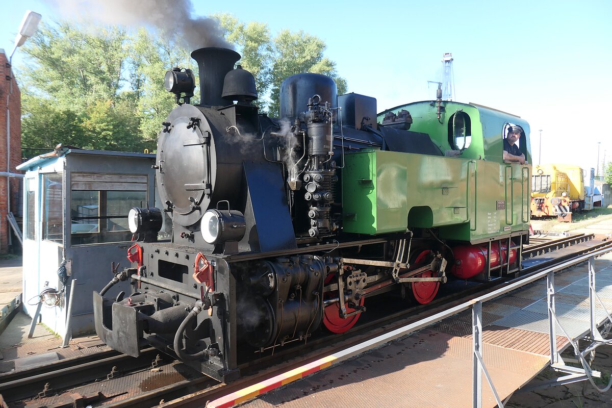 Zum Fahrzeugbestand des Museums Meuselwitzer Kohlebahn gehört auch diese aus Rußland stammende Kleinlok der Marke Kaluga. Am 2.5.2024 stand sie gerade richtig im Licht am Rand der Drehscheibe. Gerd Hahn