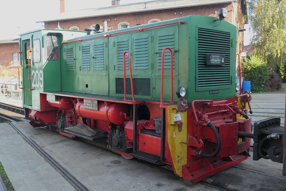 Lok 209 verlässt am 09.05.2024 mit dem Zug nach Regis-Breitingen den Bahnhof Meuselwitz. Die CFL 200 wurde 1962 von Schöma für die Braunschweigischen Kohlenbergwerke AG in Helmstedt gebaut. Christopher Pätz