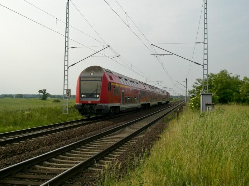 Eine RB auf dem Weg nach Leipzig Hbf, hier zwischen Lutherstadt Witenberg und Bergwitz (im Hintergrund sieht man die Elbbrücke in Lutherstadt Wittenberg)