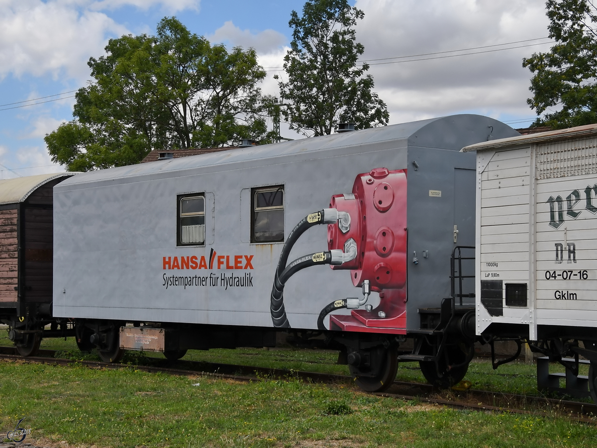 Blick auf den "Messbeiwagen FEW Blankenburg" (DR 67 50 99-68 706-2 | 75 80 891 1012-9 D-DLHBS), der während des Herbstlokfests auf dem Gelände des Lokschuppen Staßfurt steht.