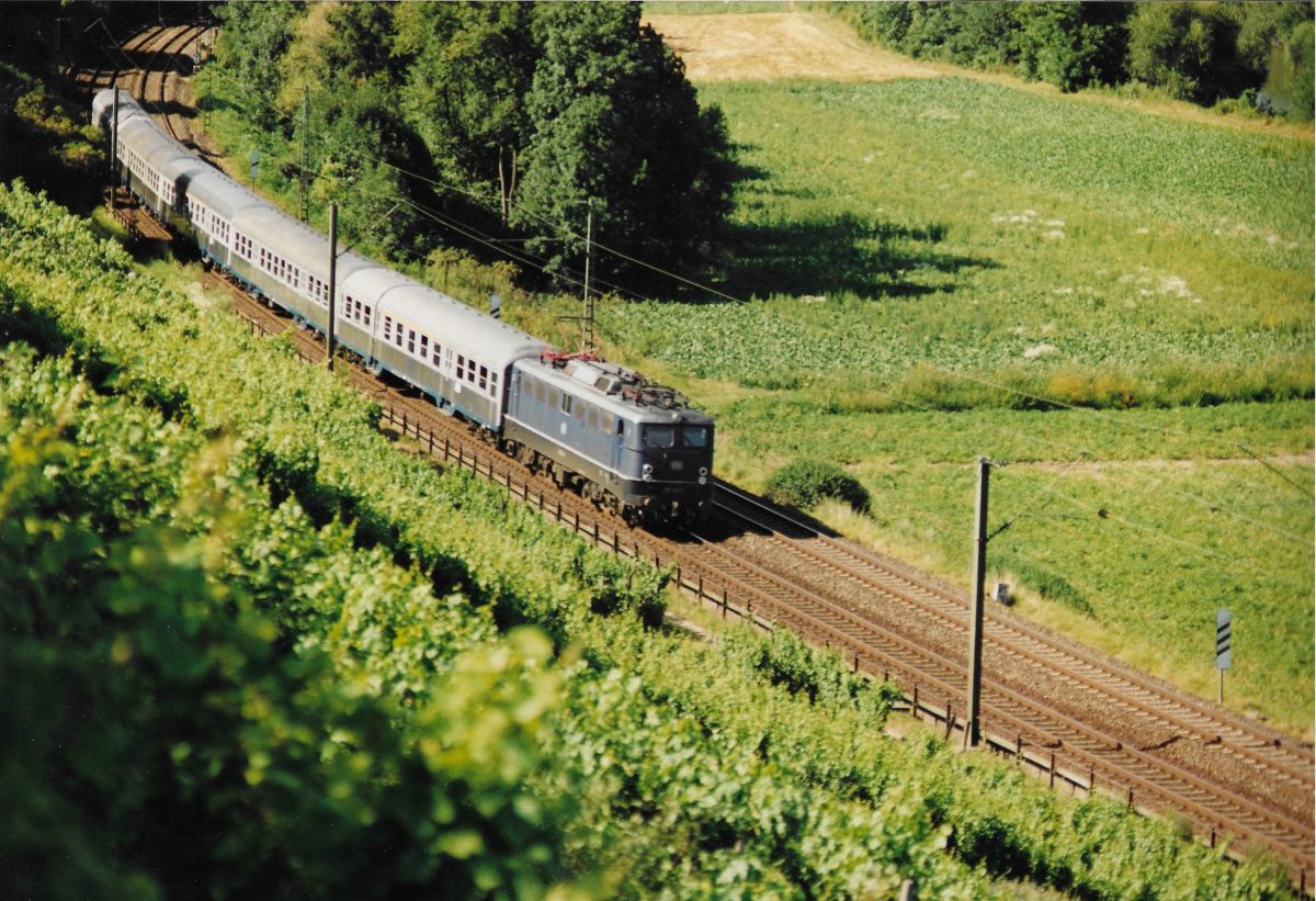 23.Juni 1990 zwischen Nordheim/Württ. und Lauffen am Neckar 110 176-5 (Bw TS) mit E3062 von Würzburg nach Stuttgart .Lok Besonderheit Führerstand 2 Doppellampen ,Führerstand 1 Einzelampe mit intigriertem Schlußlicht wurde am 23.09.1993 umlackiert Jan Stein