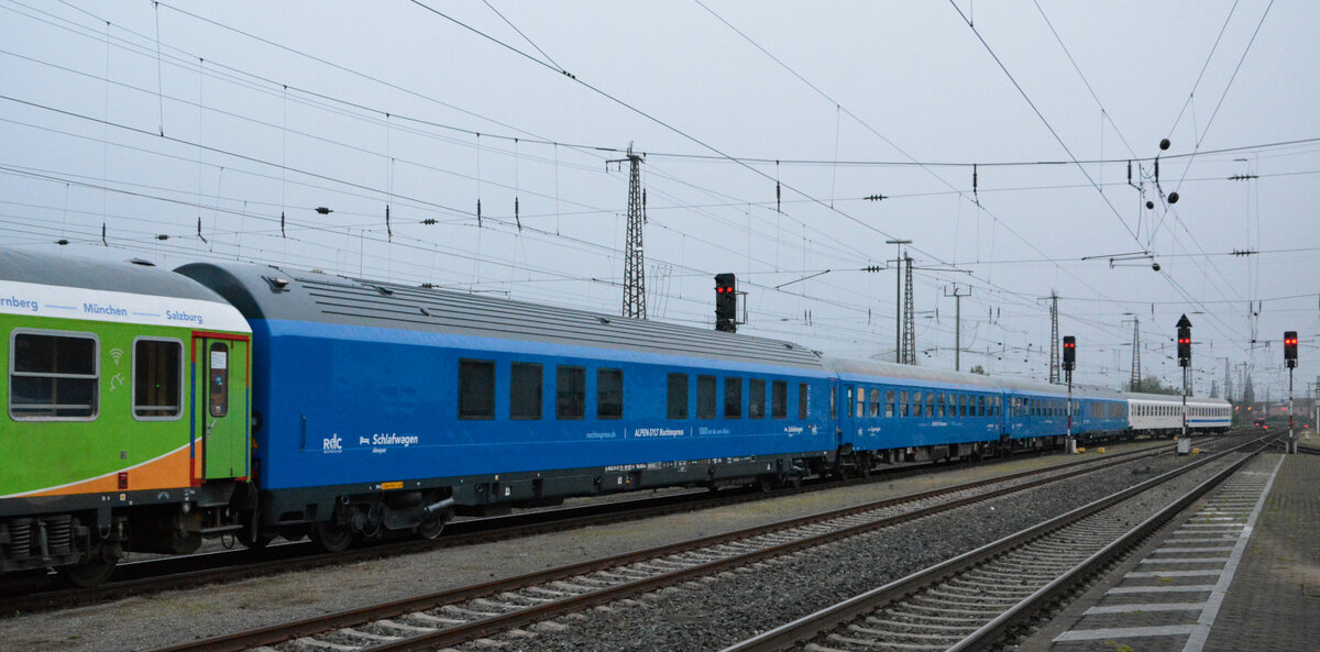 Blick auf einen klimatisierten Liegewagen mit der Bezeichnung  Bvcmz <sup>248.5</sup>  (51 80 50-91 028-9 D-RAG), der an vierter Stelle im Alpen-Sylt-Nachtexpress eingereiht ist und den Bahnhof Ludwigsburg auf Gleis 4 verlässt.