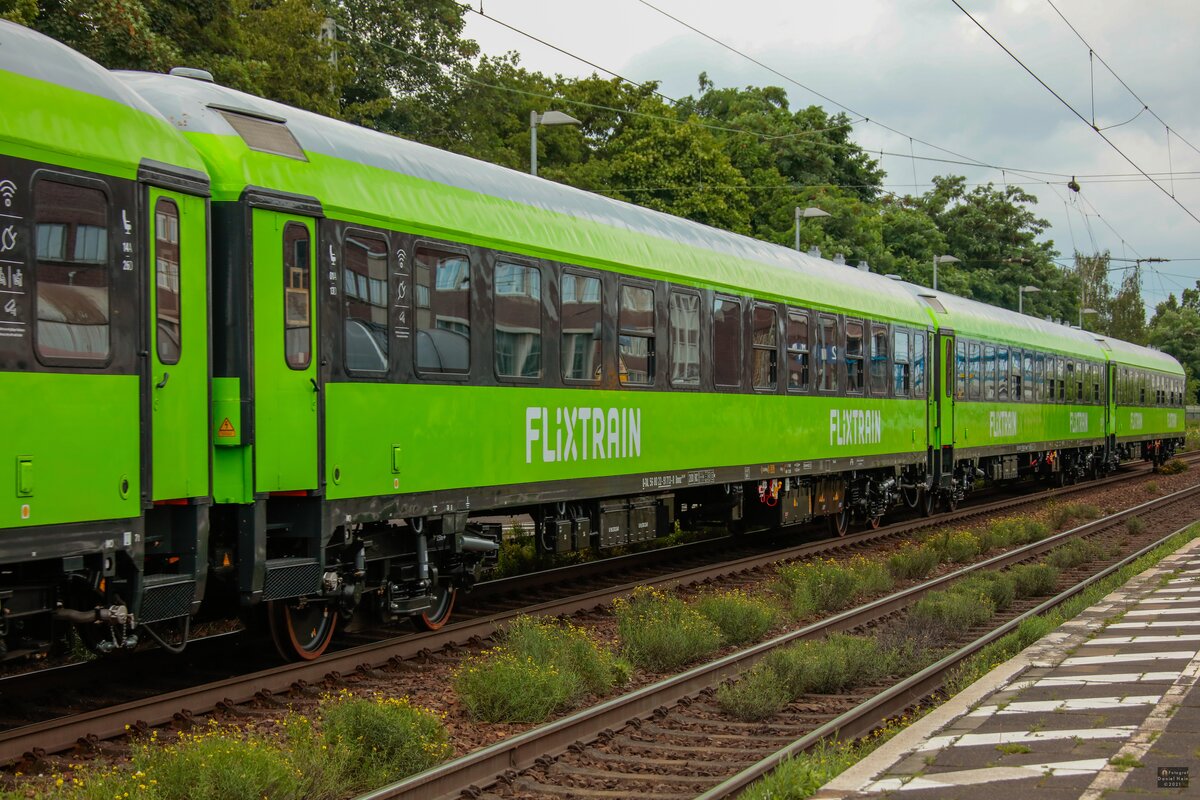 Blick auf einen klimatisierten Liegewagen mit der Bezeichnung "Bvcmz 248.5" (51 80 50-91 028-9 D-RAG), der an vierter Stelle im Alpen-Sylt-Nachtexpress eingereiht ist und den Bahnhof Ludwigsburg auf Gleis 4 verlässt. Aufgenommen vom Treppenaufgang zum Franck-Steg. 🧰 RDC Autozug Sylt GmbH 🚝 NEX89349 Westerland(Sylt)–Radolfzell 🕓 30.7.2021 | 10:13 Uhr