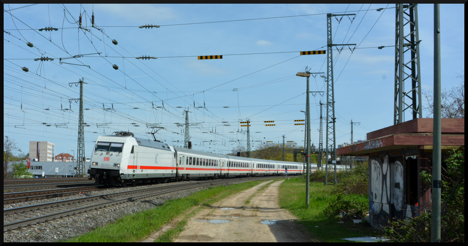 "Fake-ICE": Die in ICE-Lackierung gestaltete 101 013-1 kommt mit dem IC 2082 "Königssee" am 22.04.2023 in Würzburg um die Kurve. Der Zug verkehrte an diesem Tag wegen einer Streckensperrung in München rund 40 min verspätet und nur von München Pasing nach Hannover.