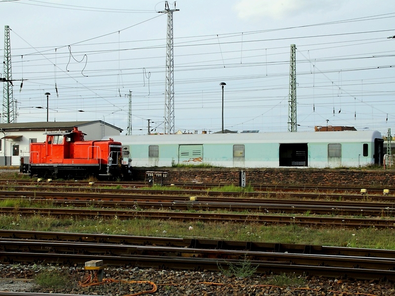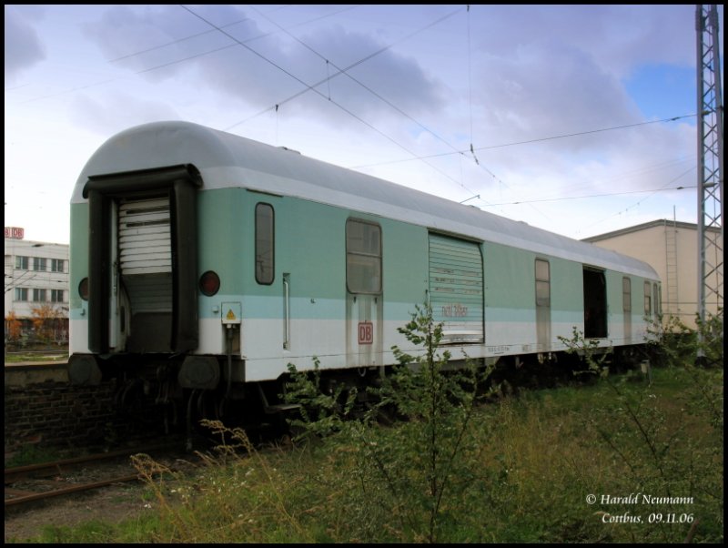 Im Bahnhof Cottbus tut dieser Dms922 noch seinen Dienst. Allerdings fährt er nur noch als Müllcontainertransportwagen innerhalb des Bahnhofs. 160 km/h - das war ein mal, die Rolltüren gehen auch nicht mehr, aber die Farbe ist selten gewoden. 09.11.06 Harald Neumann