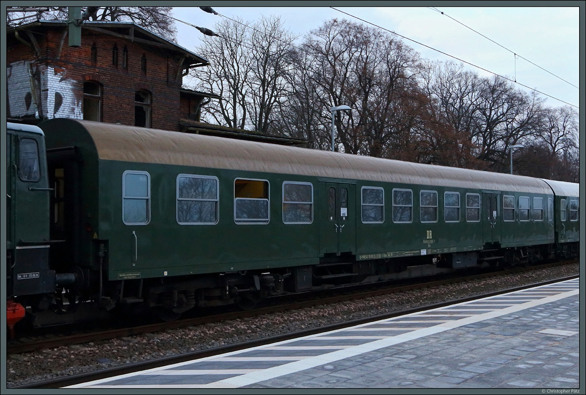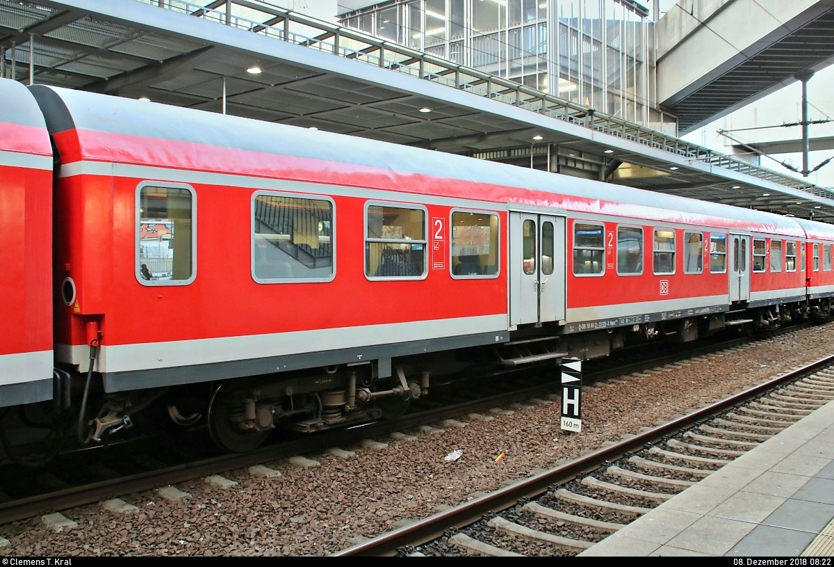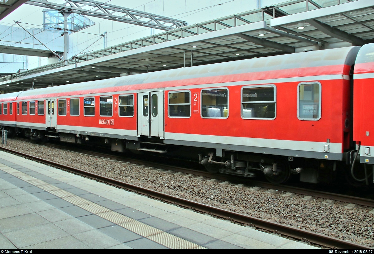 Blick auf einen Halberstädter Mitteleinstiegswagen der Gattung "Byz 439.4" (50 80 21-33 115-4 D-DB) von DB Regio Nordost, beheimatet in Rostock, der in RE 18440 "Striezelmarkt-Express" nach Dresden Hbf mit 143 193-1 von DB Regio Nordost eingereiht ist und im Startbahnhof Berlin Südkreuz auf Gleis 4 steht.