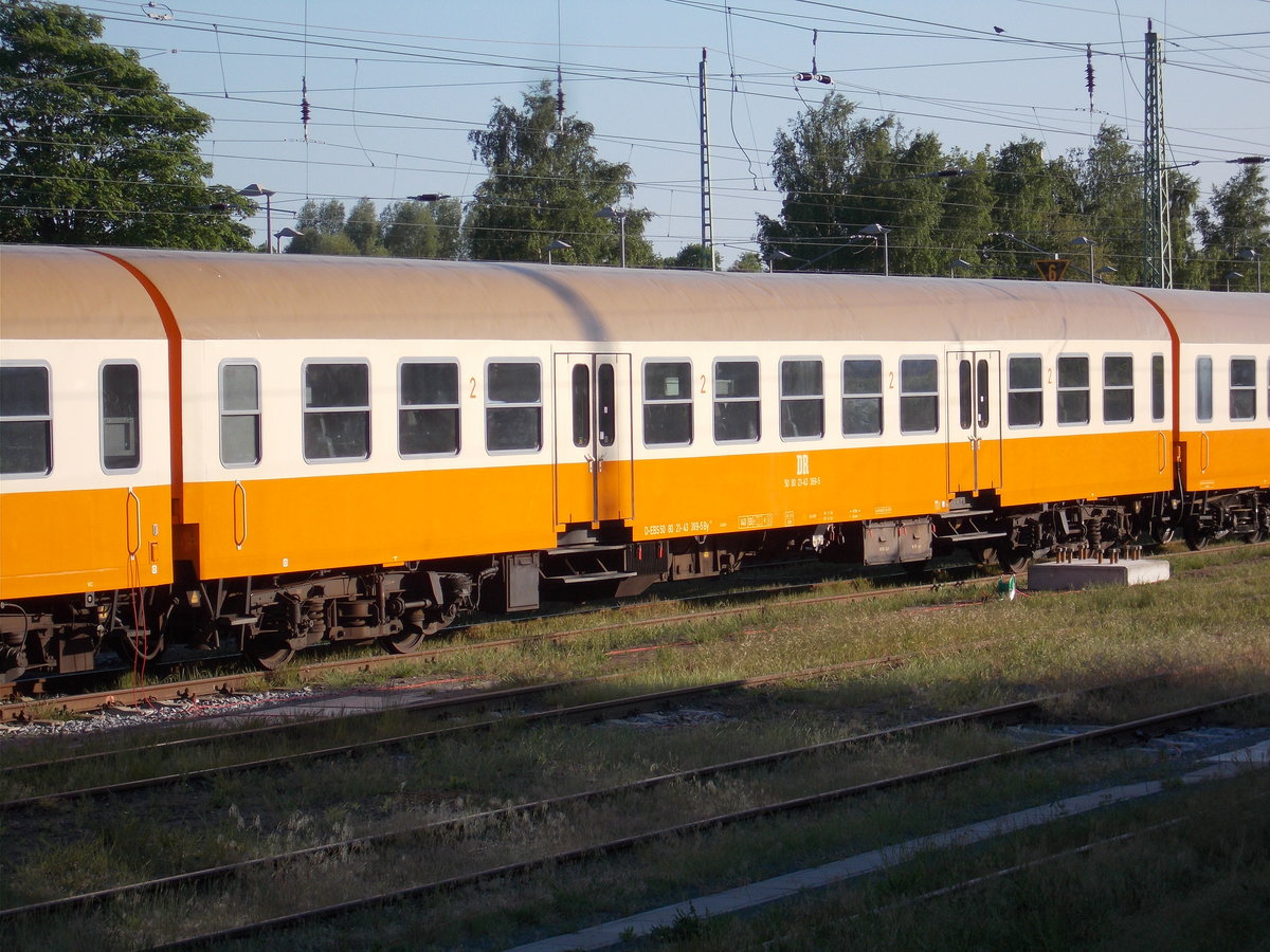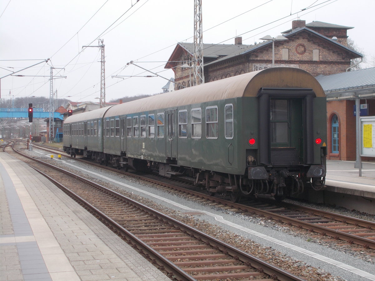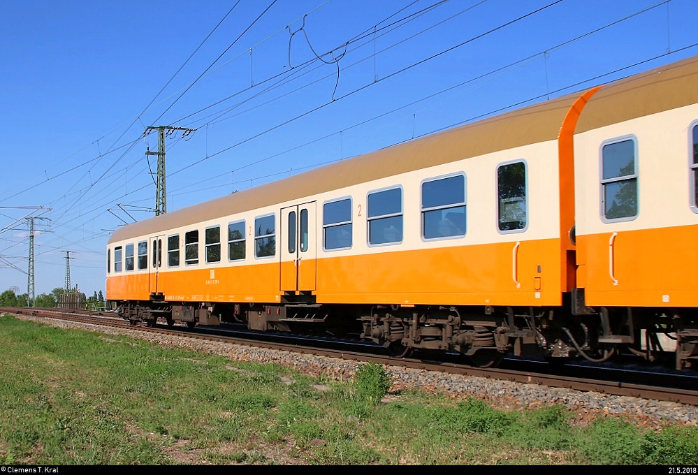 Blick auf einen Halberstädter Mitteleinstiegswagen der Gattung "Byz" (50 80 21-33 337-4 D-EBS) der Erfurter Bahnservice GmbH (EBS), der im DPE 20058 von Ostseebad Binz nach Erfurt Hbf mit Zuglok 232 334-3 (132 334-4) der Erfurter Bahnservice GmbH (EBS) eingereiht ist und die Leipziger Chaussee in Halle (Saale) auf der Ostumfahrung für den Güterverkehr überquert.
